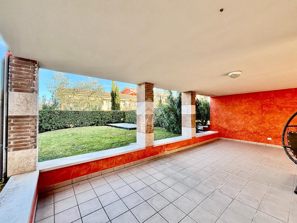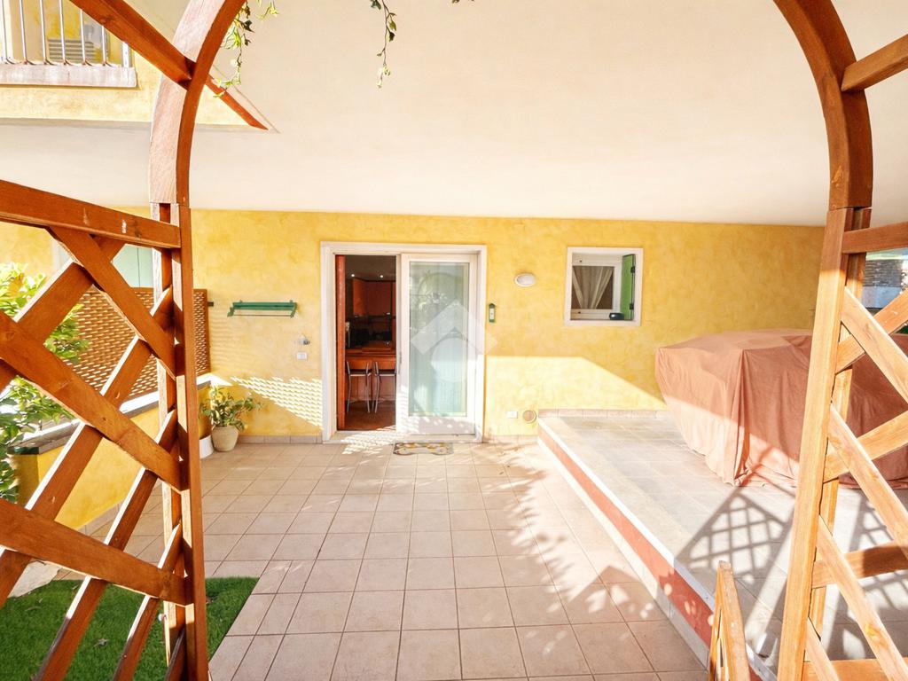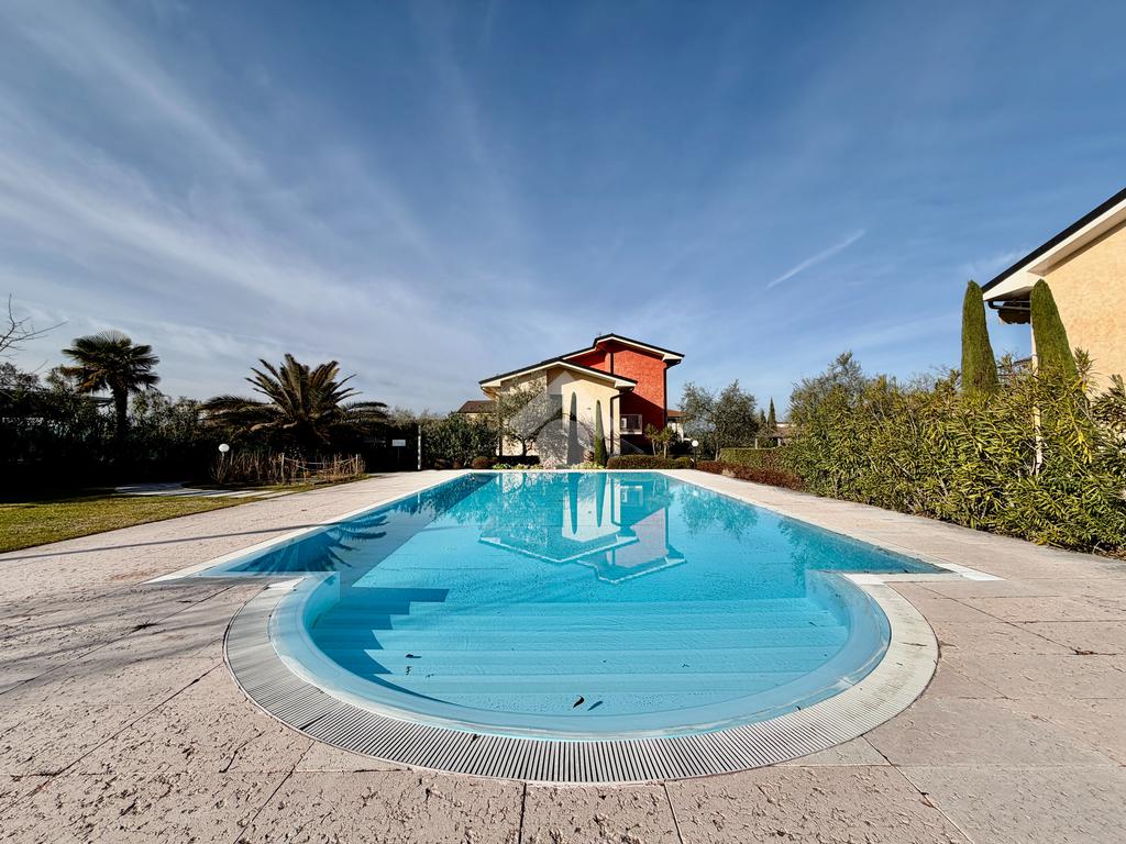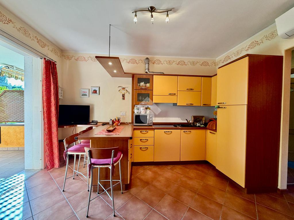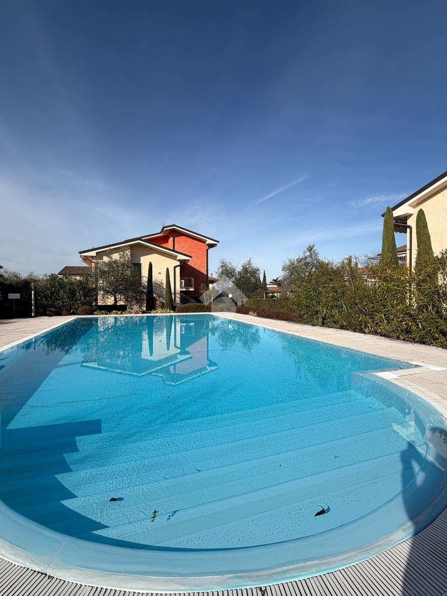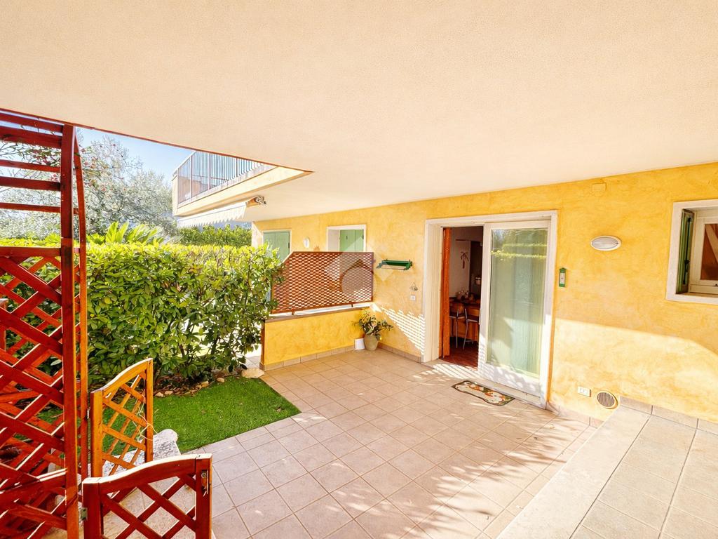 La zona giorno si apre su un ampio giardino privato e portico privato , perfetto per momenti di relax all'aperto. Gli spazi esterni sono arricchiti da una piscina condominiale, ideale per rinfrescarsi durante le calde giornate estive. L'appartamento è dotato di aria condizionata, garantendo un ambiente confortevole in ogni stagione.