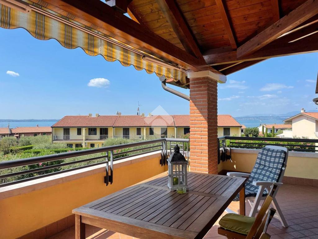 In una delle zone più prestigiose di Lazise, proponiamo in vendita un appartamento trilocale situato al piano primo all'interno di un residence con piscina e vista lago. Si accede all'appartamento tramite una scala coperta che serve solo due unità.