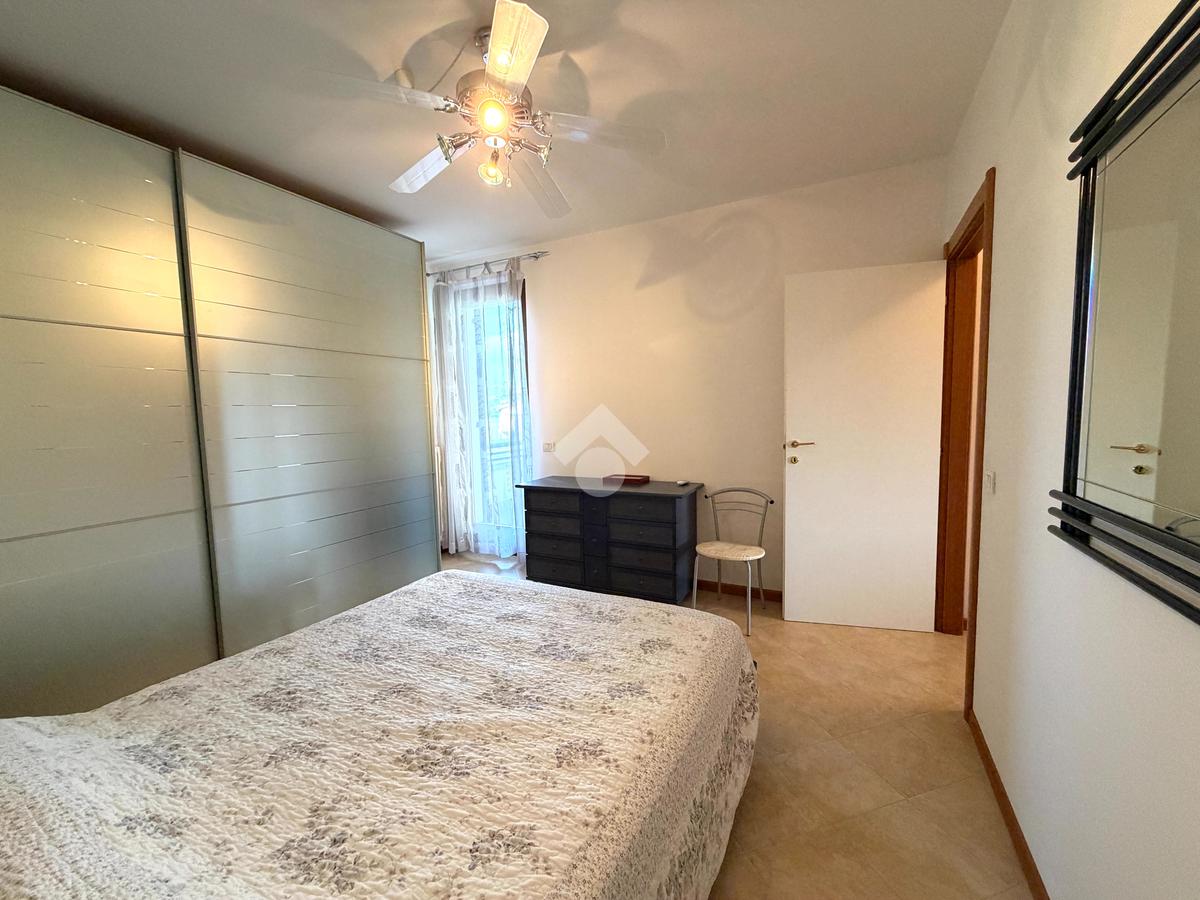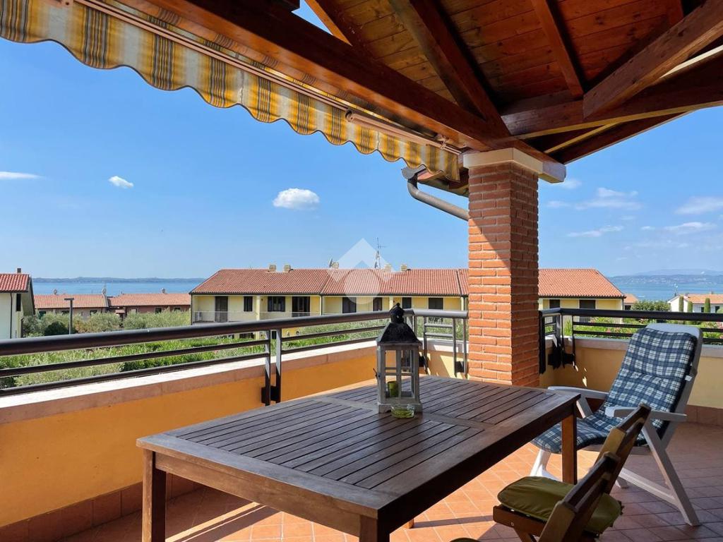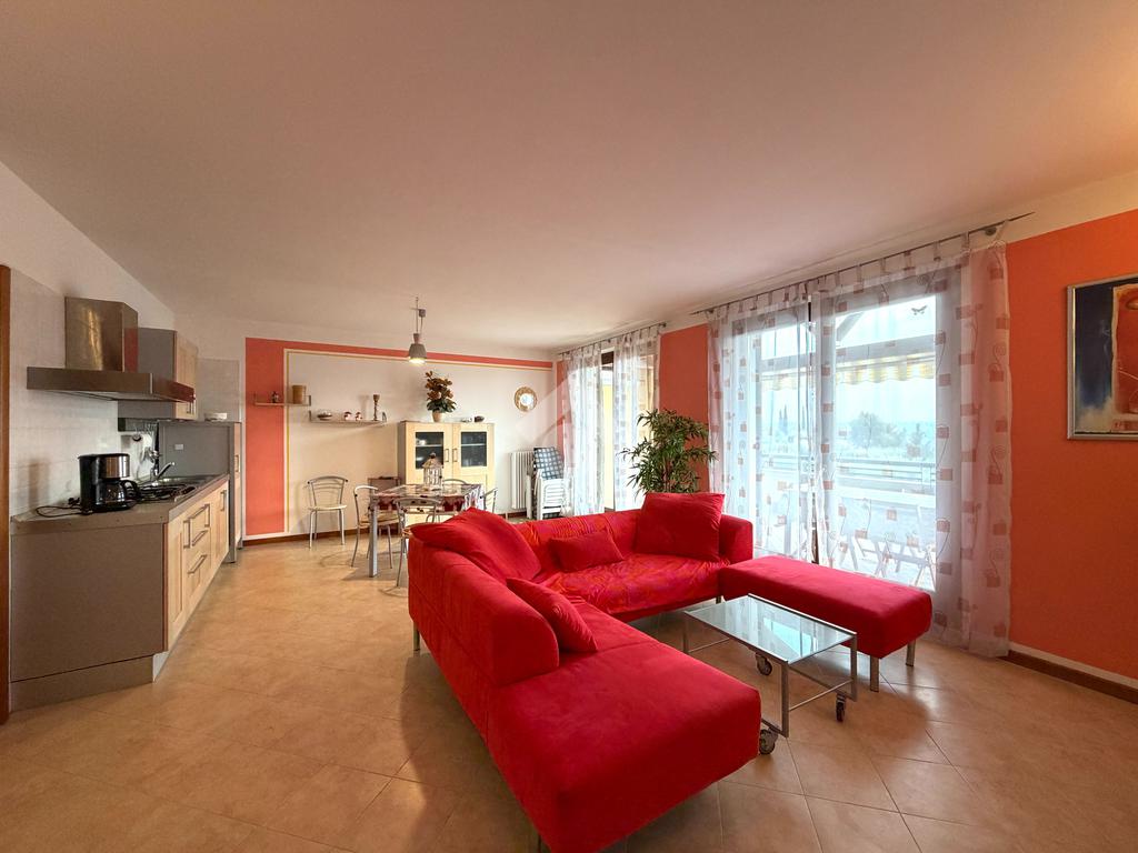 Gli spazi interni sono ben distribuiti. L'appartamento è composto da un' ampia e luminosa zona giorno con cucina a vista che, da due grandi porte finestre, si affaccia su una terrazza coperta, vero punto di forza ideale per pranzi all'aperto e momenti di relax godendo del panorama sul lago. La zona notte è composta da due camere da letto, entrambe con un balcone che affaccia sulle colline, ed un bagno finestrato con doccia.