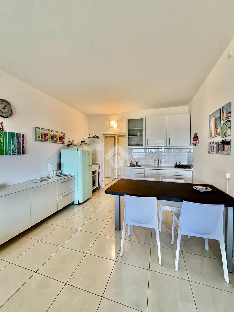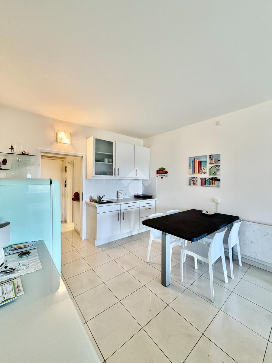 L'appartamento è composto da una stanza grande con sala e cucina e un bagno finestrato con doccia , e un terrazzo con vista lago .