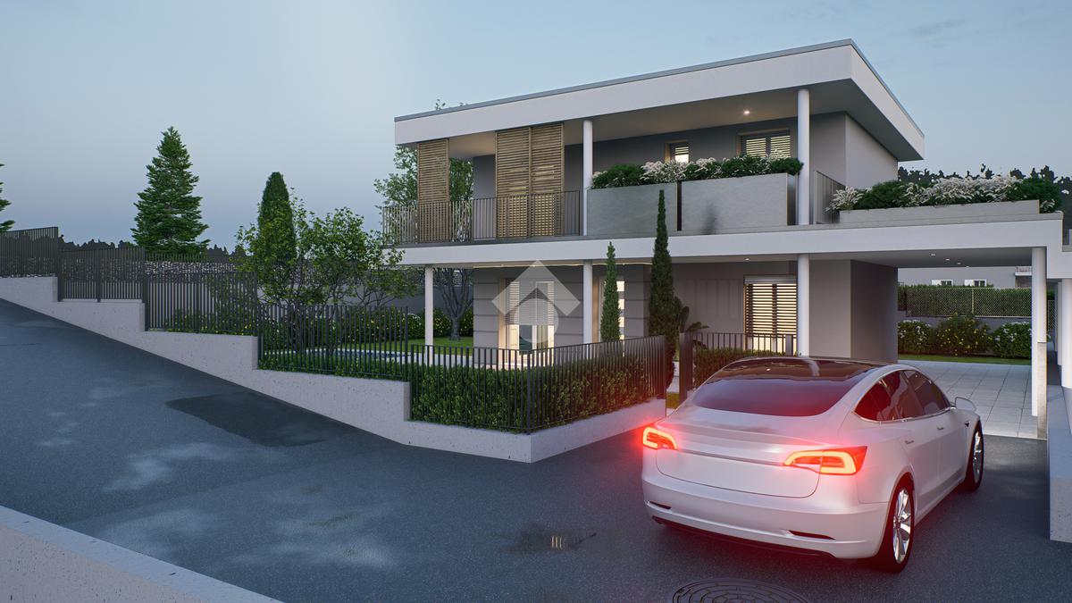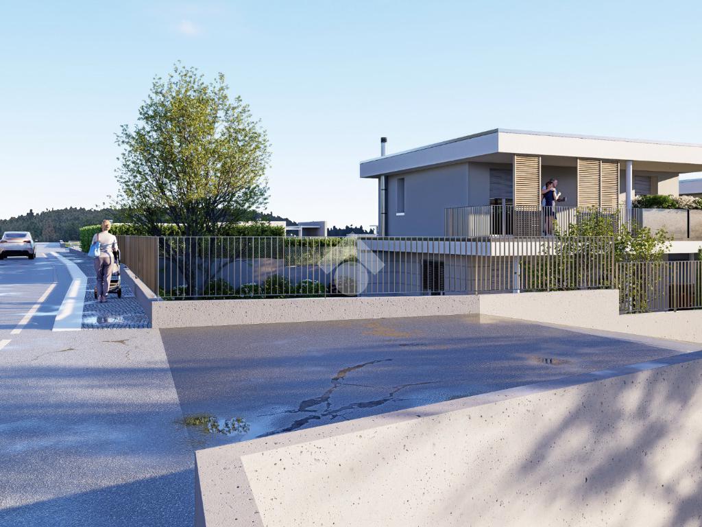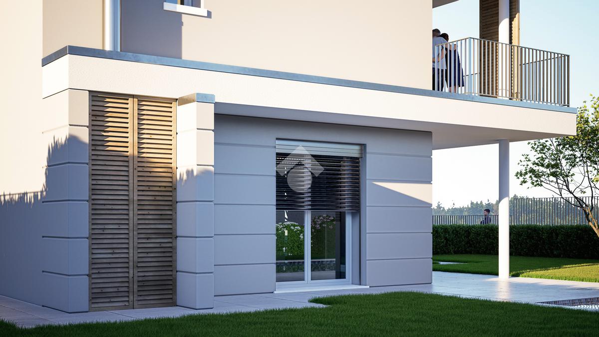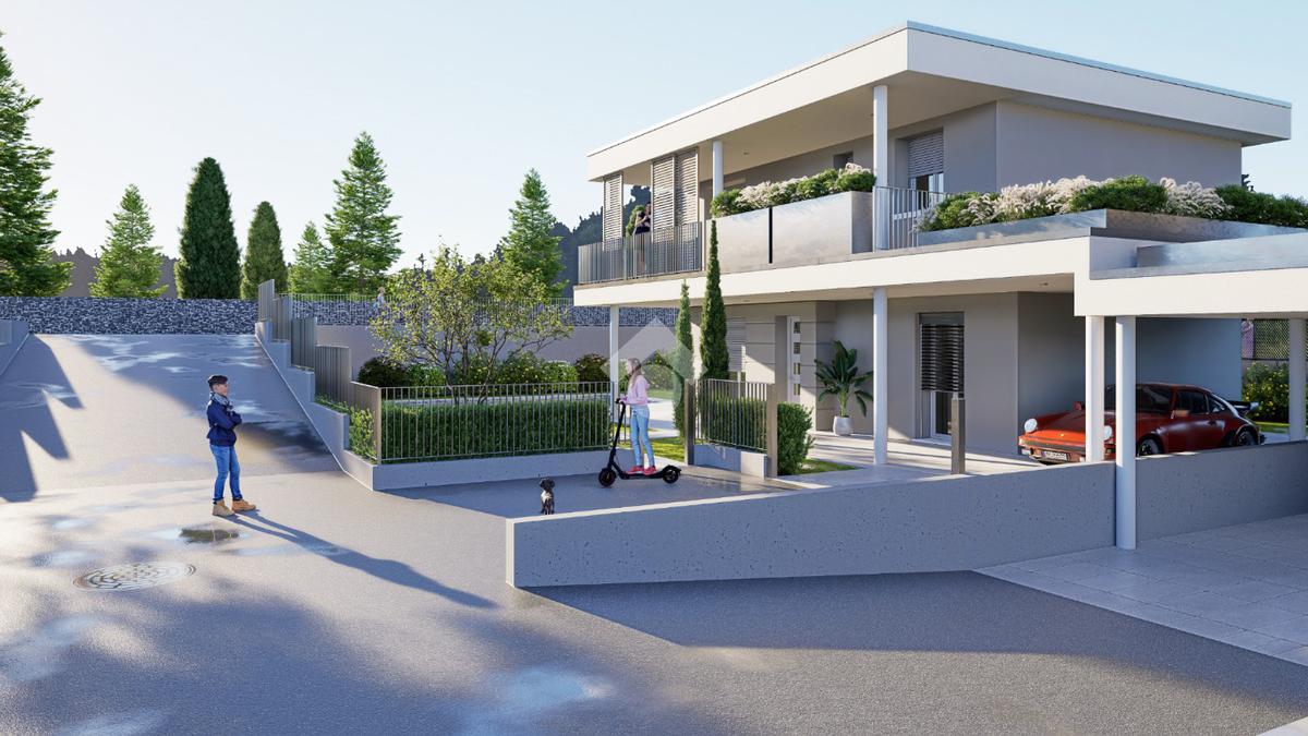 Un cancelletto pedonale invece conduce all' ingresso attraverso un vialetto pavimentato ed al giardino che si apre sulla zona giorno e tutto attorno per offrire privacy e libertà.