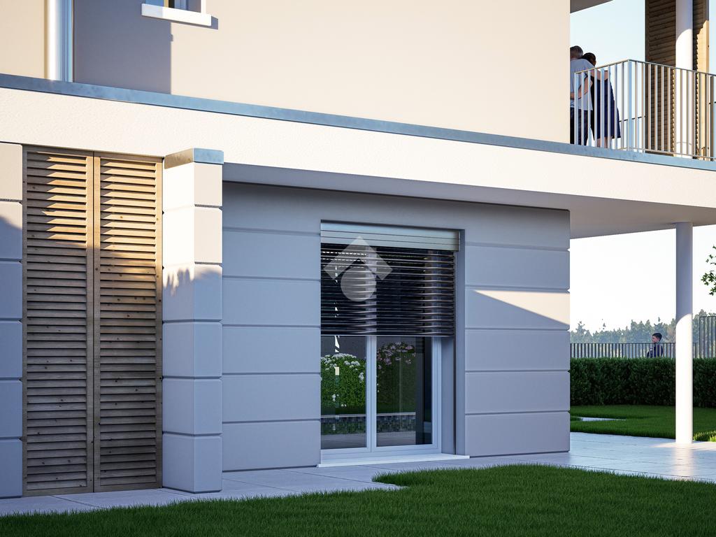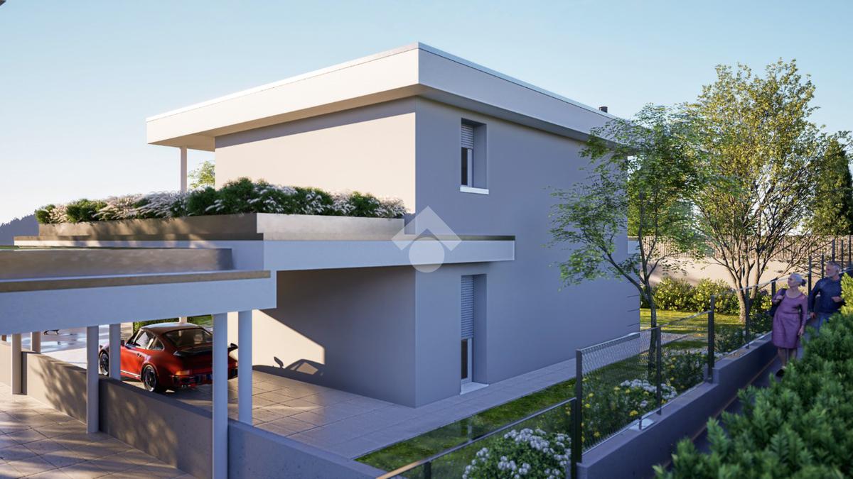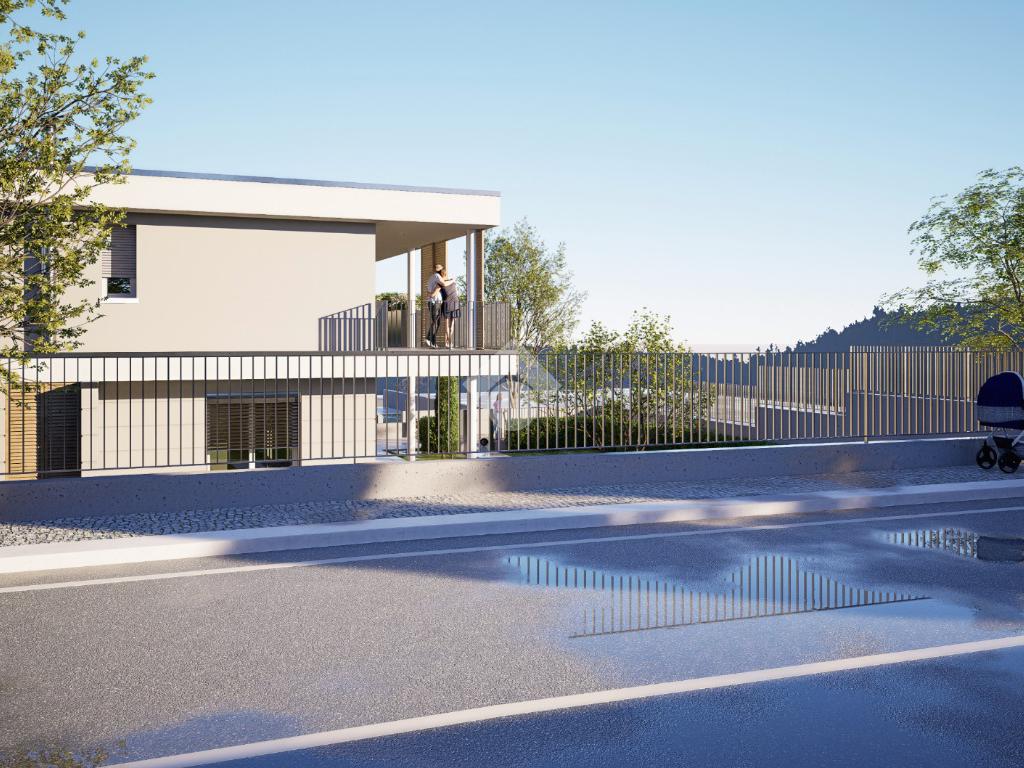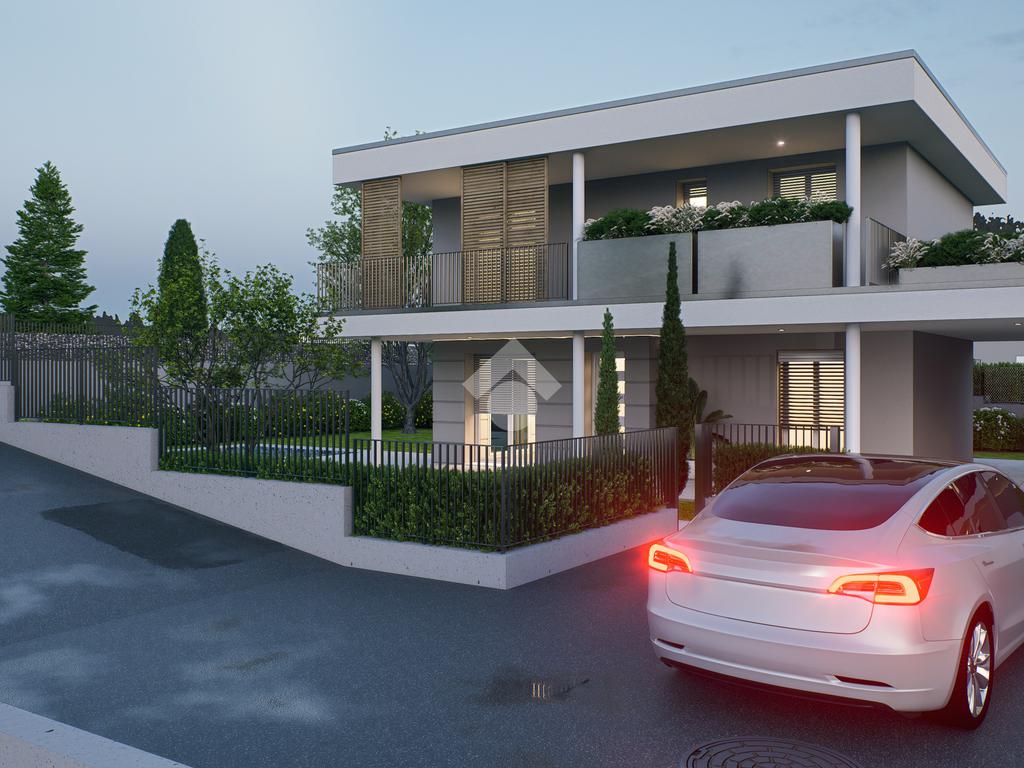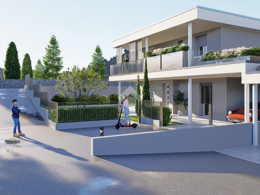 Un cancelletto pedonale invece conduce all' ingresso attraverso un vialetto pavimentato ed al giardino che si apre sulla zona giorno e tutto attorno per offrire privacy e libertà.